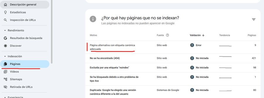 - Cuando el número de páginas con este estado crece sin control. Si de un mes para otro pasas de tener 50 URLs en este estado a tener 500, algo está generando duplicados masivos de forma automática. Puede ser un plugin, una migración mal ejecutada o la generación de parámetros por una campaña de marketing.